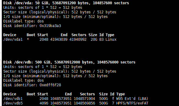 //2、确认是否没有分区的磁盘,如下图,没有分区的磁盘是/dev/sdb,在您的服务器中可能是/dev/vdb,请注意按照实际名称修改